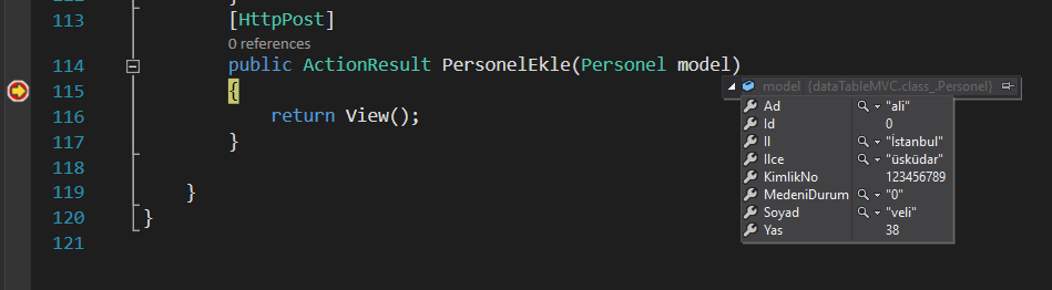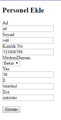 Gönder butonuna bastığımız zaman PersonelEkle  ActionResultına  verileri POST ediyor.