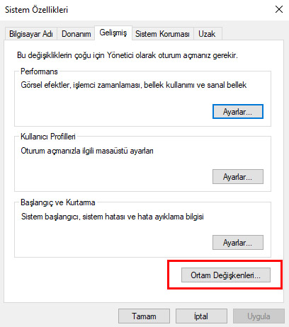 Bilgisarım > özellikler > gelişmiş sistem ayarlarını açalım