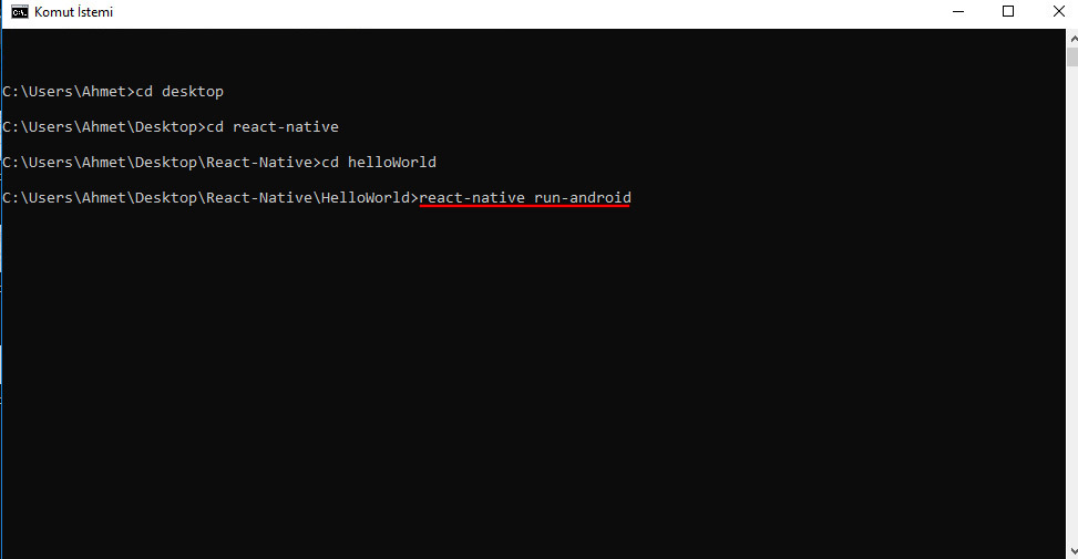 android emülatör çalıştırdıktan sonra cmd ekranından projemizi bulunduğu dizine gelip aşağıdaki kodu çalıştırıp projemizi başlatalım.